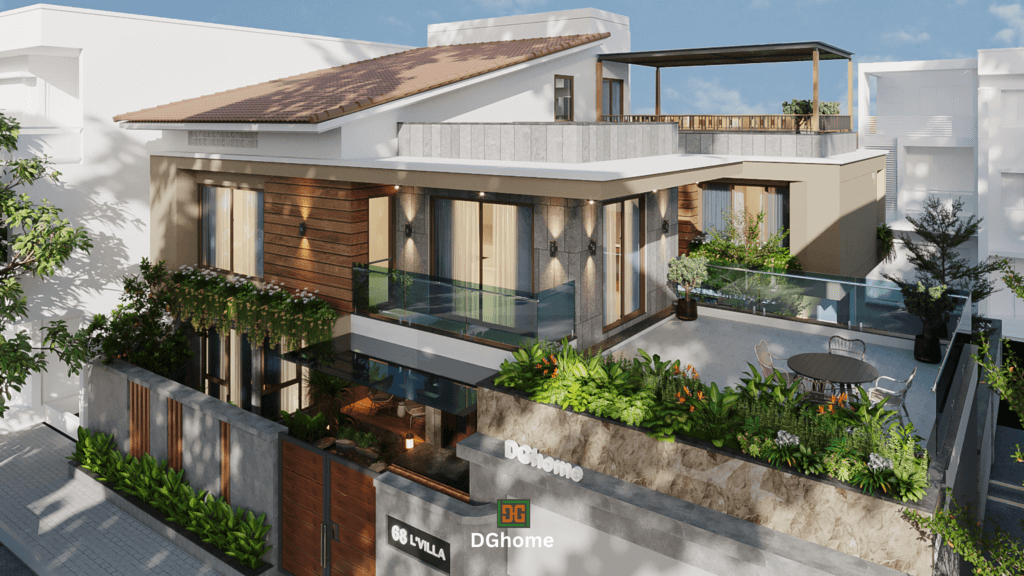 Mẫu nhà 2 mặt tiền này có sân vườn trên ban công, với lợi thế là đón ánh sáng, gió, không khí lưu thông tốt hơn.